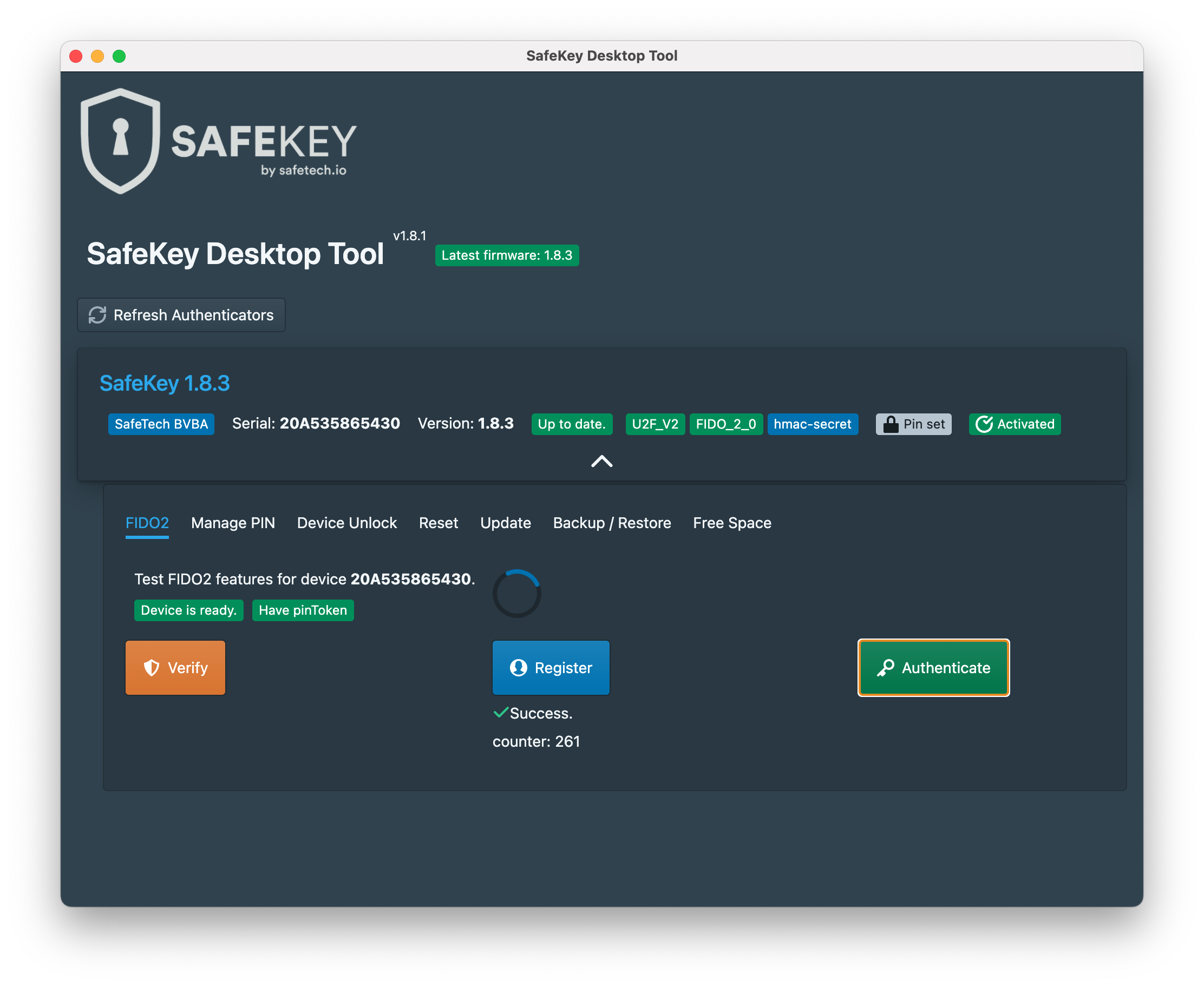 5\) If the **login test is ready** and your SafeKey is working as expected, SafeKey Desktop Tool should show the message **"Success"** below the "Authenticate" button.