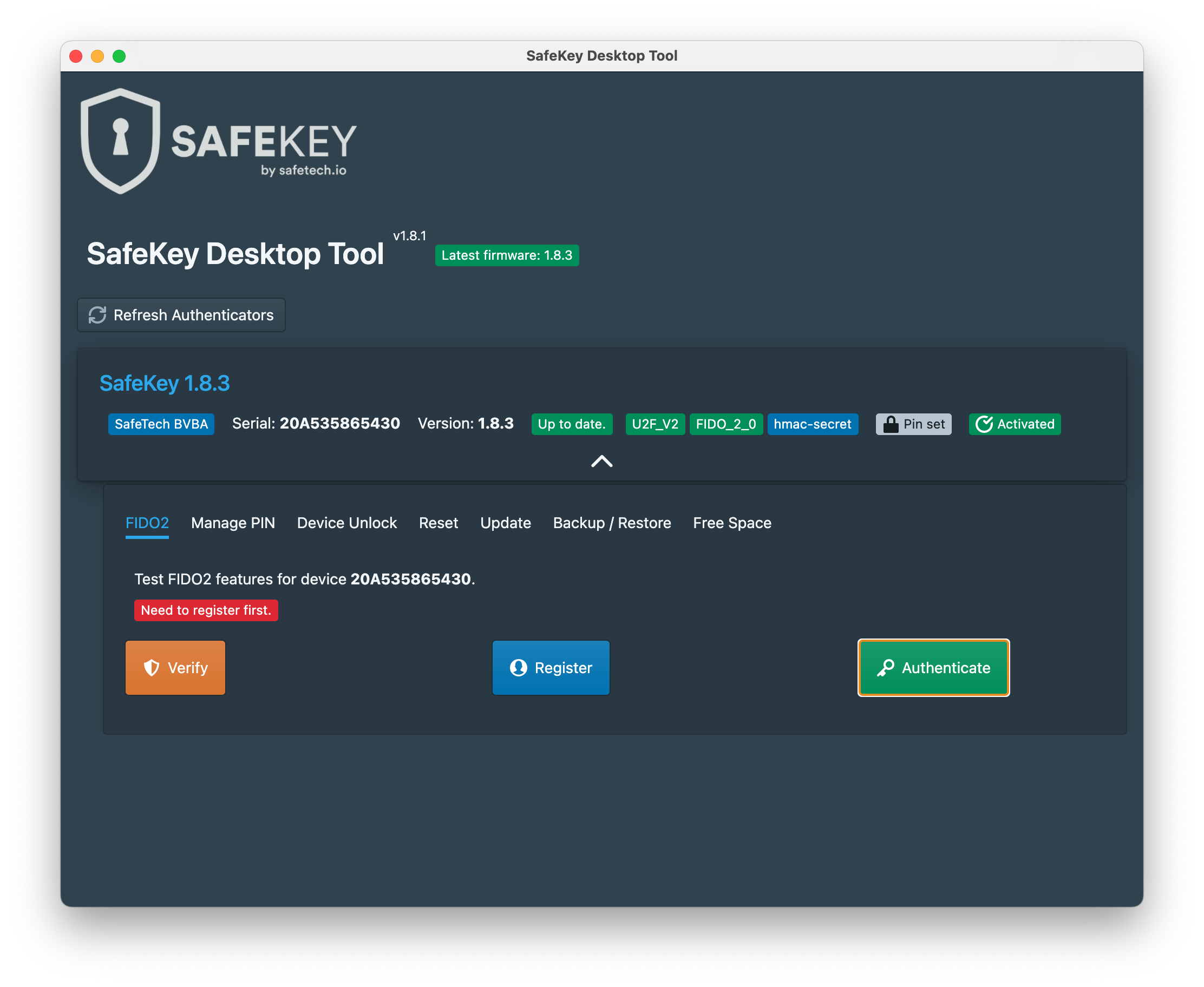 1\) Click the **green "Authenticate" button** to start the login test of the connected SafeKey device.
