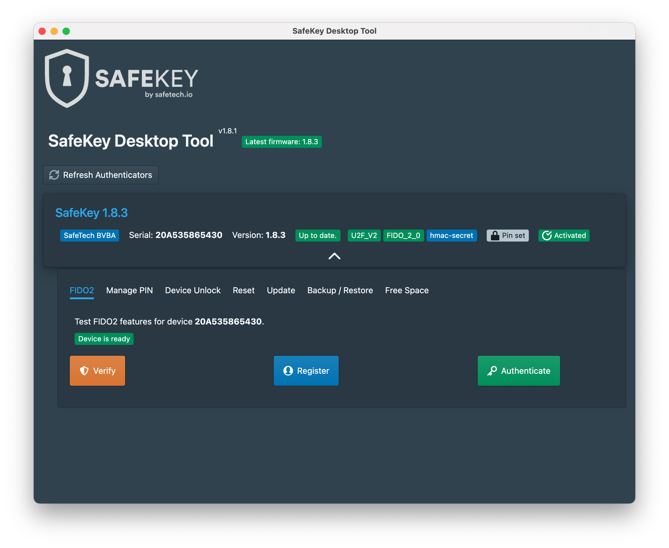 4\) **Touch your SafeKey** to verify the connected device.